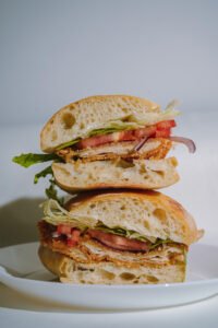 Ekşi mayalı ciabatta ekmeğine; özel sosunda 8 saat marine edilmiş tavuk schnitzel, sarımsaklı mayonez, taze marul, domates ve kırmızı soğan